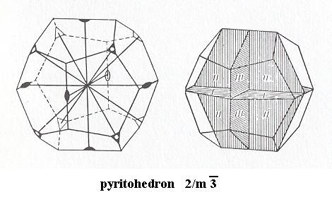 Figure 6. Pyritohedron, Stereometric Basic Form of all the (single) crystals of the Duakisdodecahedric Class of the Isometric Crystal System. Symmetry content is indicated (Small triangles with holes : 3-fold rotoinversion axes. Small black ovals : 2-fold rotation axes. In the right image the prevailing mirror planes are indicated. The next Figure again depicts the Pyritohedron, but without all the indications.