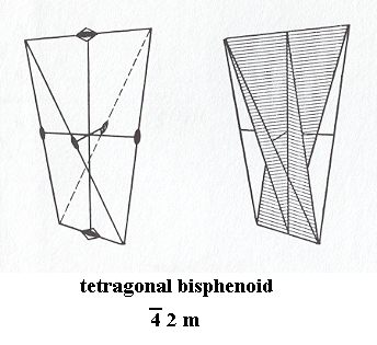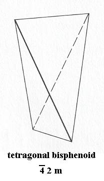 The promorph is accordingly that of the Allosigmostaura pseudobisphenoidea (Stauraxonia homopola sigmostaura) (in calling them "pseudobisphenoidea" we indicate the fact that although crystals of this Class can assume the shape of a bisphenoid, this bisphenoid does not possess all the symmetries of a geometrical bisphenoid (which is 4* 2 m). In crystals we can observe this lesser symmetry by means of features like etch figures. So we, who are looking for a geometrical solid expressing all (but at the same time exclusively) the symmetries of the present Class (Which here is the possession of just a 4-fold rotoinversion axis), cannot use the Bisphenoid. We have used the above bipyramid instead.