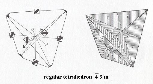 Figure 4. Regular Tetrahedron, Stereometric Basic Form of all the (single) crystals of the Hexakistetrahedric Class of the Isometric Crystal System. Symmetry content is indicated (Small squares with solid oval : 4-fold rotoinversion axis. Small triangles : 3-fold rotation axes. The right image displays the prevailing mirror planes.