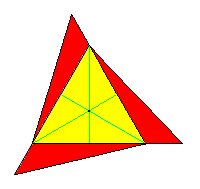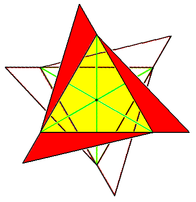 Figure 8. Construction of one of the (equal) bases of the Trigonal Gyroid Twisted Apical Bipyramid, from the base of a regular trigonal pyramid. The 3-fold rotation axis is in the center of the depicted form, as indicated.