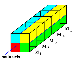 Figure 3. Diagram explaining the relationship between antimers (red, green, blue, yellow) and metamers ( M1, M2, M3, M4, M5 ). The m e t a m e r s are repetitions along the body's main axis. The a n t i m e r s are repetitions about the body's main axis.