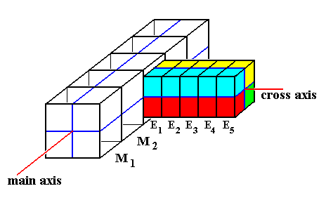 Figure 4. Diagram explaining the relationship between body trunk, paramers (red, green, blue, yellow) and epimers ( E1, E2, E3, E4, E5 ). The e p i m e r s are repetitions along a cross axis. The p a r a m e r s are repetitions about a cross axis.