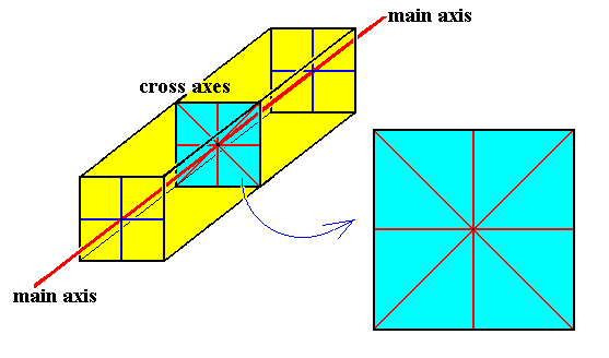 Figure 2. Diagram exemplifying the relationship between, and the position of, the main axis and the cross axes (in this example there are four cross axes) of an organismic body. This body's equatorial plane, in which the cross axes lie, is indicated in blue. Axial system is indicated in red.