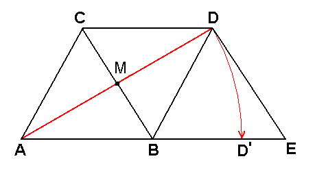 This objective distinction is present, though, in the (inward) finite gapless discretum. For a three-dimensional gapless discretum the arrangement of the real points (and thus not that of the negation-acts) is cubical (piled hexahedrons), whereas for a two-dimensional gapless discretum this point arrangement is that according to equilateral triangles, or squares. In such a discretum we can distinguish "real" and "imaginary" lines, because real lines consist of points that all lie at precisely one unit-distance from one another, while this is not the case in imaginary lines. And because here we can identify "real line" with "rational line" (because all these lines are measurable with the one unit-distance), and every "imaginary line" with "irrational line" (because in this discrete geometry every real line is in fact rational by definition and every imaginary line is irrational by definition), it is now clear that in the inwardly finite gapless discretum there exists a univocal distinction between rational and irrational lines. What then in the form of the univocal distinction between rational and irrational straight lines is lost in continuous space, is copiously made up for by the reality which the irrational straight lines (in addition to the rational lines) enjoy in this space, a reality, which they lack in discrete space. See next Figure, which depicts a small region of two-dimensional triangular (hexagonal) discrete space. The points A, B, C, D, and E are space net-points. The 'point' D' is not a netpoint. The distances AC, AB, BC, BD, CD, BE, and DE are unit distances, they are equal to one another. AD is not a unit distance, neither is it a multiple of it. When we place AD alongside AE (which is two unit distances long), it will end at a location which we have indicated with D'. And D' is not a real space point. Also M, the location of intersection of the two diagonals, is not a real space point. The triangles ABC, BED and BCD are equilateral triangles.