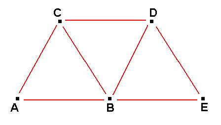 The red lines symbolize the unit-distances of the points A, B, C, and D of a small piece of the hexagonal space point-net. These points are real points possessing qualitative content. The minimum distances are all equal to one another, they are all 1, therefore the triangles are equilateral triangles. Indeed, because the points of discrete space lie at the absolutely minimum distance from one another, i.e., in considering only our depicted fragment of discrete space, point A from point C, A from B, B from C, B from D, and C from D, we can legitimately say that these points 'touch' one another (contrasting with their coincidence). They are separated from one another, not by yet other points, but by real negation-acts. And precisely because these negation-acts are themselves not spatial points they reside outside space itself. But with all that we now have a problem : How things are as to the distance between A and D? Clearly, they are at a distance from one another that is greater than the unit distance, but not at a multiple of it, as is, for example the distance between the points A and E :