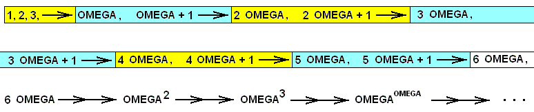 This contradiction cannot be removed by adding to the transfinite number OMEGA yet more units (in order to make the "infinite" which had turned out to be finite, truly infinite), because then we get infinitely many (i.e. not halting somewhere) transfinite numbers of the form OMEGA + 1, OMEGA + 2, OMEGA + 3, ... , 2.OMEGA, ... , 3.OMEGA, 4.OMEGA, ... , OMEGA2, ... , OMEGA3, ... , OMEGA4, ... , OMEGAOMEGA, ... , OMEGAOMEGA + 1, OMEGAOMEGA + 2, ... , etc. And we then in fact have to do with the same situation as with the not-ending series 1, 2, 3, 4, ... . Ineed, if we, as we did in the series 1, 2, 3, 4, ..., OMEGA, place every transfinite number of the series (such as the first OMEGA, and then also all OMEGA's in OMEGA+1, OMEGA+2, 2.OMEGA, (2.OMEGA)+1, 3.OMEGA, etc.) outside the series, then we are no longer counting anymore, i.e. we then are not uninterruptedly carrying on counting anymore (we then 'count' : 1, 2, 3, 4, ... , 1, 2, 3, 4, ... , 1, 2, 3, 4, ... , etc.), and moreover, the whole series (and its parts) has then become finite.