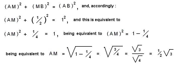 Let us, in discrete space, look to the imaginary straight line AD. The length of this imaginary line is measured with the unit distance in the discrete (triangular) space. This unit distance we find between the real points A and B, A and C, D and C, B and D, B and E, D and E, etc. The length of AD is twice that of AM, and the length of the latter can be determined by means of the rectangular triangle AMB. We then have according to the theorem of Pythagoras :