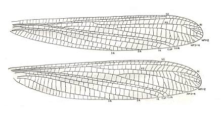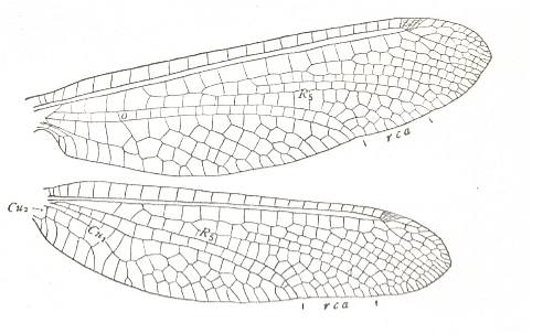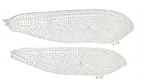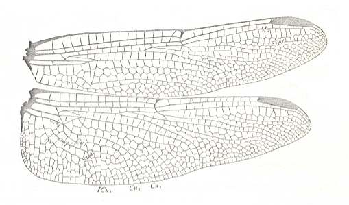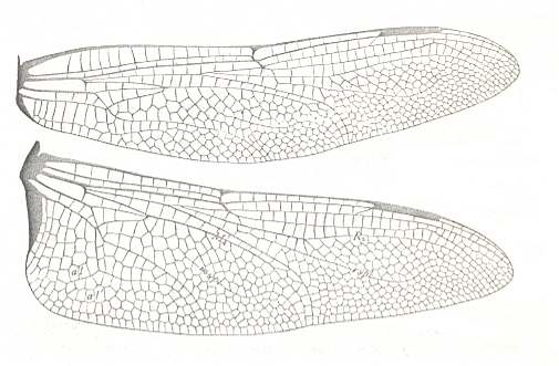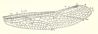A fairly neatly expressed homonomy of the wing-pairs is preserved. Homonomy of middle and hind thoracic segements also well expressed. The same is the case in the muscular apparatus, indicating a rigorously equated homonomous structure. The wings are distinctly elongate, with a straight anterior margin and well-expressed costalization. They are devoid of folds. The venation is very rich, with a large number of, not only longitudinal, but also cross-veins. Sometimes cross-veins are absent, and in their place an archedictyon is found [dense venational mesh work between the longitudinal veins]. Body of insect elongate, with a broadened head and thorax and a narrowed long abdomen. Size of the insects medium or large. Wings usually longer than abdomen, and about equal to the body. Body, although as a rule significantly elongate (such as in Aeschna), in a number of cases a little more stocky (as in Libellula and also in the fossil Palaeodictyoptera).
