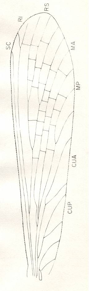 Figure 7 : Wings of Acanthaclisis, Family [prob.] Myrmeleonidae, Order Neuroptera-Planipennia. A species from the Seychelles Islands. Recent. (After COMSTOCK, 1918.)