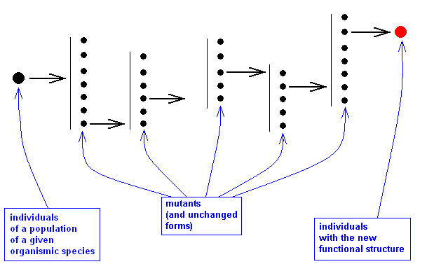 This is in fact acknowledged even in Darwinian theory. And that's precisely why it does not suppose truly linear evolutionary lines definitively leading, step by step, to such a functional structure (and to a whole organic strategy for that matter, of which it is but a part). For such structures to come into being Darwinian theory admits of mere random changes (of the phenotype as a result of such changes in the genotype) being all what is needed. And indeed a random change is one that is caused by factors that just happened to be present instead of factors that must be present. So no mysterious final causes need to be assumed. As such, it is true, a process of repeated (but different) random changes can never result in the formation of a functional structure relevant and useful to the individuals of the species concerned. So Darwinian theory, while insisting that the material world is capable of creating such functional structures, calls for continued natural selection of mutants that phenotypically represent an incremental increase of the overall fitness of these mutant individuals. These individuals are supposed to be just a part, a population, of the original species, while the other part remains unchanged, as is assumed in Hennigian phylogenetic systematics (as being the macroscopic phenotypical consequence of Darwinian theory), and which is evident when comparing taxa that are 'advanced' in certain characters with other related taxa which are not, in the same respect. And so the process of creating a given functional structure does not, in this Darwinian theory, proceed like this :