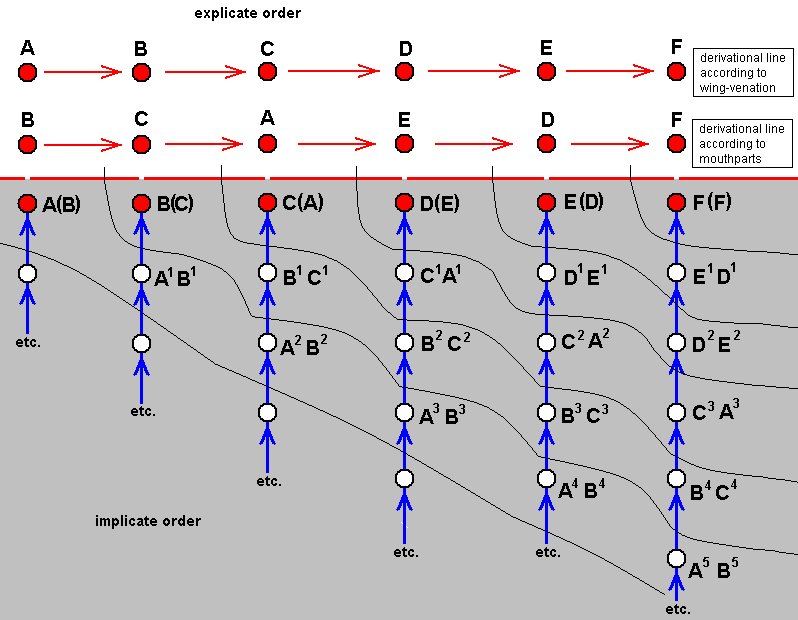 In the Explicate Order we have the species A, B, C, D, E, and F, forming two derivational series as to respectively wing-venation and mouthpart structure.