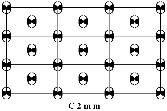 Figure 5. Placing motifs with point symmetry 2mm in a centered rectangular net, yields a periodic array of motifs representing Plane Group C2mm.