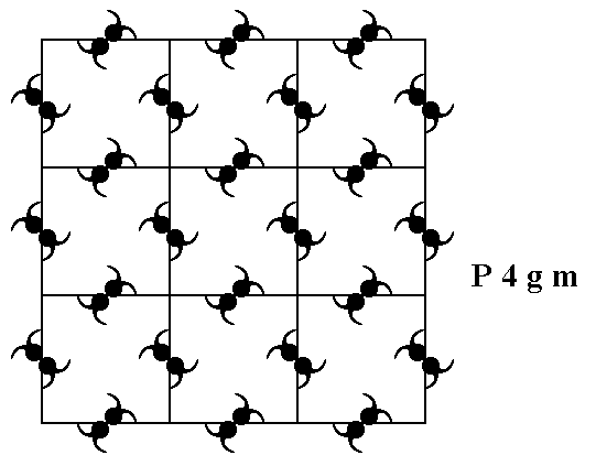 Figure 9. A periodic pattern of motifs based on a 2-D square lattice (net). This particular pattern represents the Plane Group P4gm. It must be imagined to extend indefinitely over the 2-D plane. In the present representation each (composed) motif consists of four motif units (commas), such that the symmetry of the composed motif is 2mm . Each motif unit represents a group element.