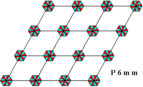 Figure 13. When motifs, having point symmetry 6mm (i.e. having a 6-fold rotation axis and two types of mirror lines), are inserted into a (primitive) hexagonal net, a pattern of repeated motifs will emerge that represents Plane Group P6mm.