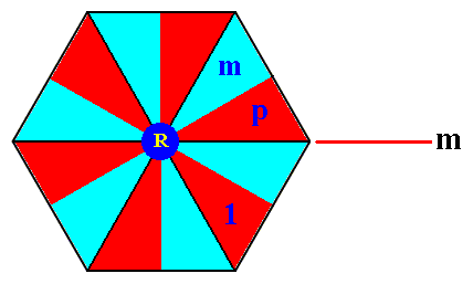 Figure 14i. Composed motif (of the P6mm pattern) consisting of six symmetric motif units. Two of them are provided with a notation. Each such motif unit in fact consists of two symmetrically related basic motif units. These non-basic motif units cannot represent group elements. The one denoted by 1 is in fact the subgroup {1, mp} (in the notation above [See Figure 14d ], referring to basic motif units), which has the structure of C2 ( The element mp is of period 2, which can easily be verified in Figure 14d ).