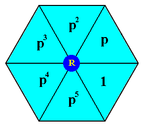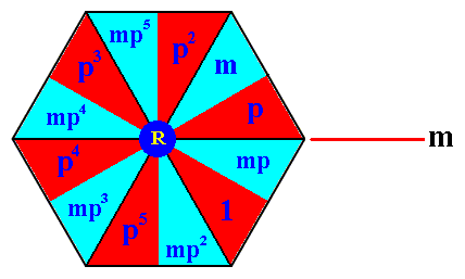 Figure 14j. By the generator p the remaining elements of the subgroup D6 are generated : Given 1 (initial element) and p (generator), the element p2 results after two times applying p to the initial element. The element p3 results from three times applying p , etc., while p6 = 1 , where p is an anticlockwise rotation of 600 about the point R .