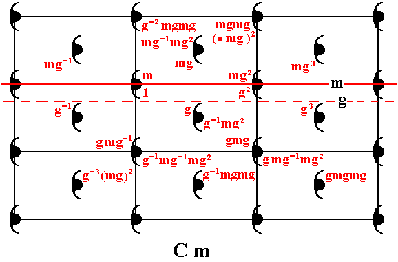 In the pattern representing Plane Group Cm as depicted in Figure 1, we have (composed) motifs, each consisting of two motif units -- commas --, such that the composed motif has point symmetry m (i.e. it has a mirror line as its only symmetry element). The motif units represent group elements.