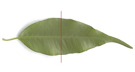 Figure 5. An organ ( a leaf of the genus Ficus ), consisting of two paramers. The lateral axis of the organ is indicated by a red line. The central vein indicates the main axis. The dorso-ventral axis is perpendicular to the plane of the Figure and goes through the point of intersection of the main axis and the lateral axis. The median plane of the leaf is perpendicular to the plane of the Figure and contains the main axis and the dorsoventral axis.
