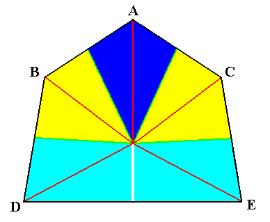 Figure 8. Diagram illustrating the symmetry relations of bilateral sea-urchins. The five antimers are indicated by colors and letters. Darkblue ( A ) : unpaired dorsal antimer. Yellow ( B and C ) : paired dorsal antimers. Light blue ( D and E ) : paired ventral antimers. Radial cross axes are indicated as red lines. The main axis of the body is perpendicular to the plane of the drawing and goes through the point of intersection of the cross axes. A+B+C is called the Trivium, D+E the Bivium.