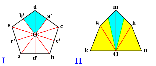 The next Figures (I, II, III) illustrate some of the above mentioned features. The images represent pyramidal bodies by means of drawings of their respective bases (or, equivalently, their equatorial planes). The tip of these pyramids should be imagined to lie precisely above the point marked by O.