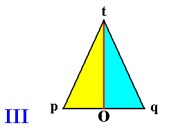 III : Base of a pyramid having two symmetric antimers (indicated by blue and yellow). The pyramid's main axis is perpendicular to the plane of the drawing and goes through O. The center of this pyramid is the plane that contains the main axis and the (interradial) axis Ot. This plane is at the same time the median plane of the pyramid. The two antimers lie on either side of the median plane. They have this plane in common. They lie, as it were, around this plane, i.e. around the body's center.