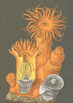 The next Figures depict some Coelenterates in which we can clearly see that the actual bionts are not articulated (segmented) along their main axis, and thus represent just metamers. The first Figure depicts, it is true a colonial Coelenterate, but the reason that we insert it here is that it clearly shows how an individual anthozoan polyp and its skeleton is constructed.